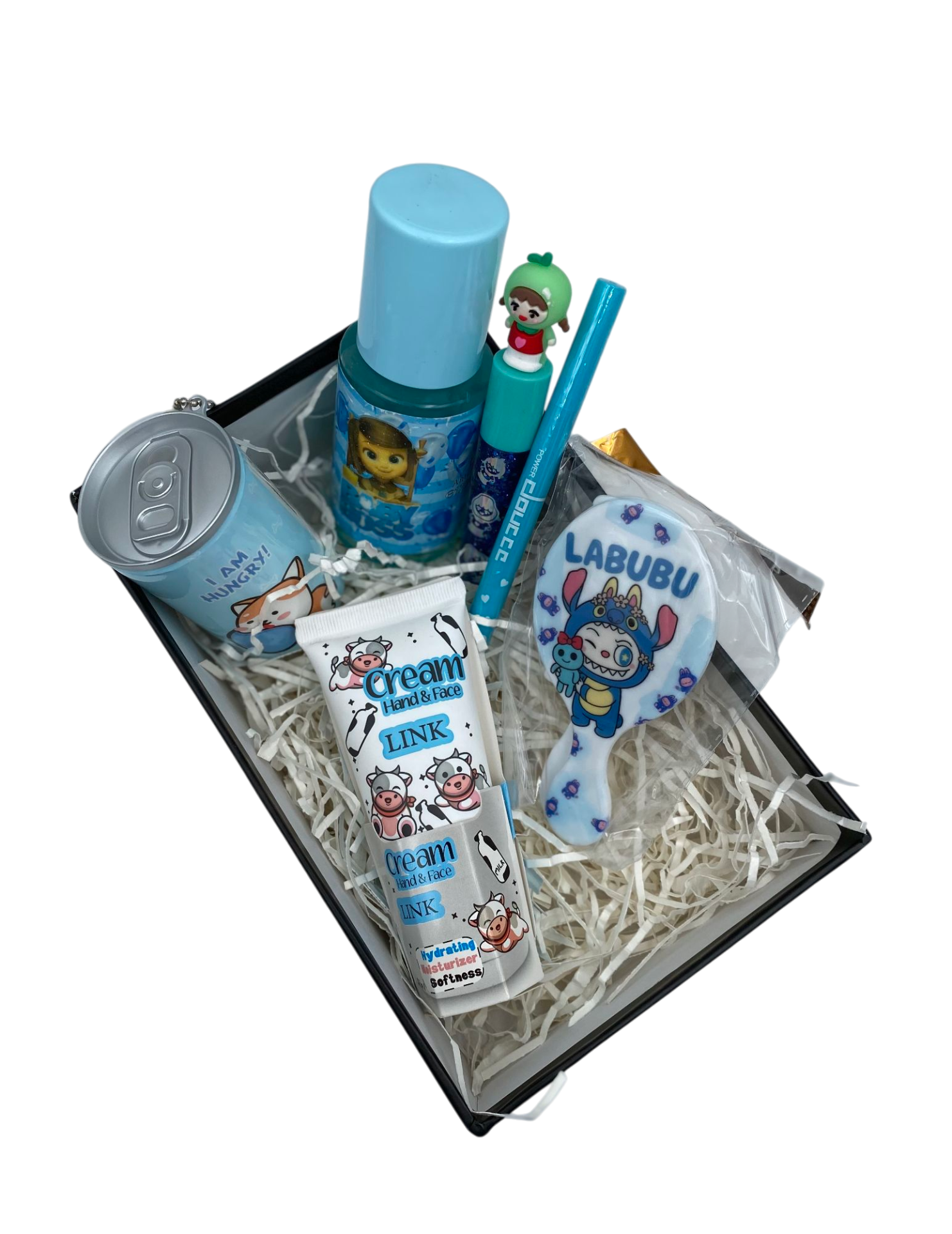 این پک کودک با تم آبی و کاراکتر محبوب LABUBU طراحی شده تا هم جذاب باشد هم کاربردی. داخل این جعبه شیک، اقلام بهداشتی و فانتزی انتخاب شدهاند تا کودک از استفاده روزانه لذت ببرد.